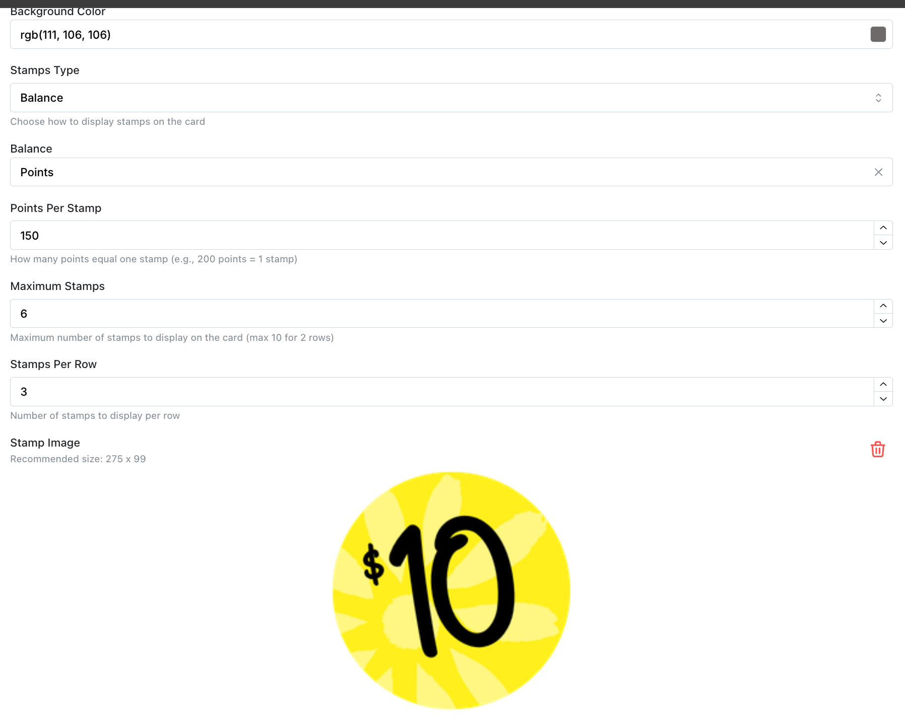 Lastly, set how many stamps you would want to display on the card, and how many rows. There is a maximum limit of 10 stamps per row. After uploading your stamp image, the finish product would look something like this.
