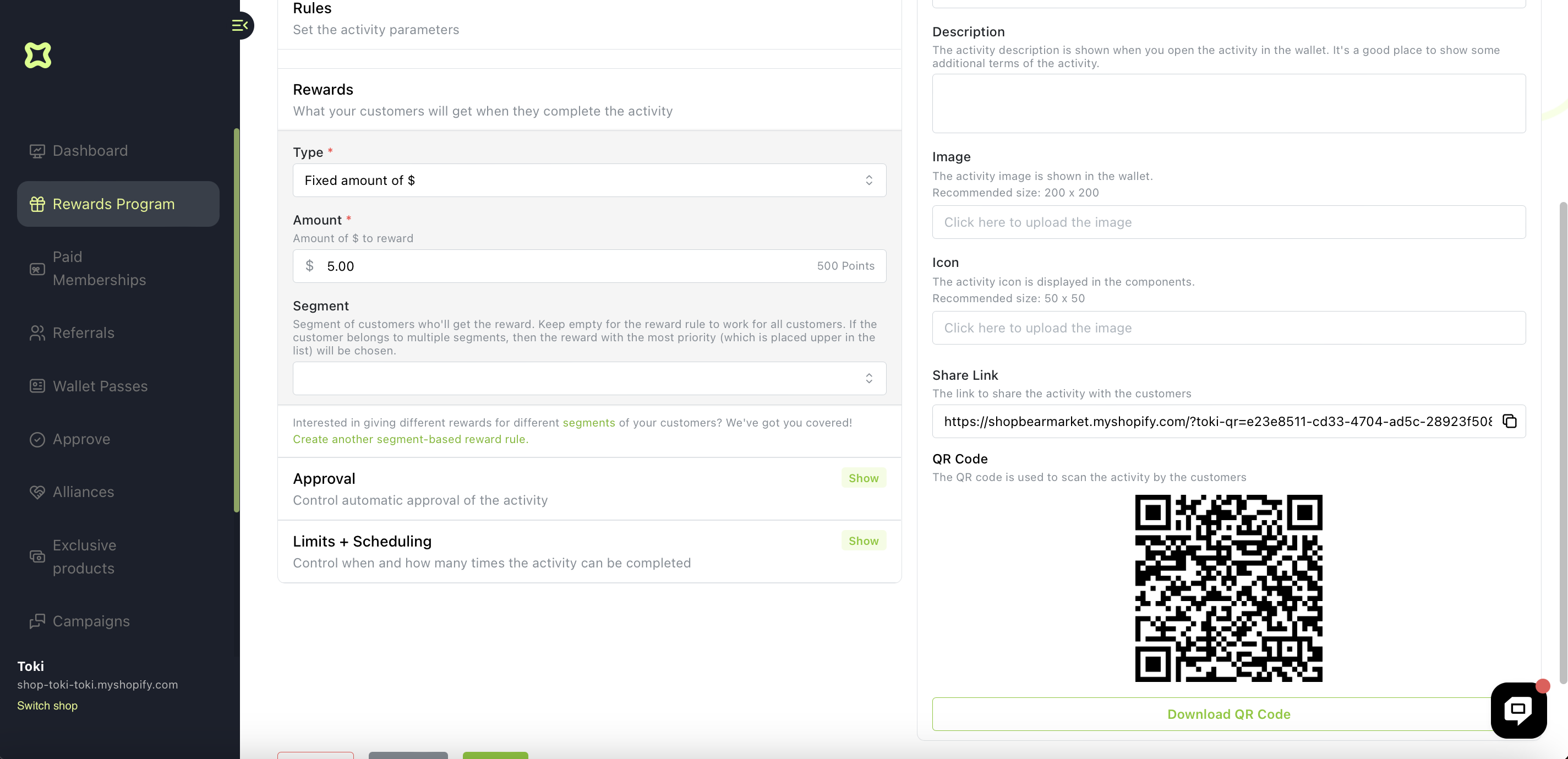 Toki now has a QR code generator so if you want to reward your users for scanning a QR code, we can automatically create one linked to a scanning activity. You can easily download the QR code to print and place wherever you like in stores or marketing materials.